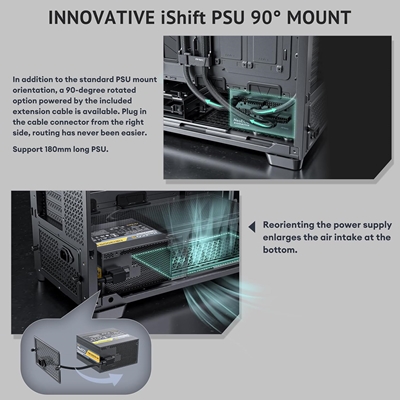 Max PSU Length (including cables): = 180 / 300mm (with HDD), = 470mm (without HDD), = 180mm (side mount)