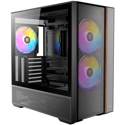 The Antec FLUX Rear Mid Tower PC Case combines style and functionality with a tempered glass side panel, walnut wood accents, and five PWM fans for optimal cooling. Compatible with ATX, Micro-ATX, and ITX motherboards, it features tool-free installation and ex