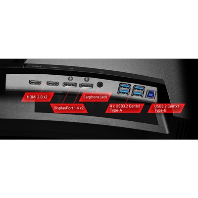 o2 x HDMI™ 2.0, 2 x DisplayPort™ 1.4, 1 x USB3.2 Gen1x1 Type-B, 4 x USB3.2 Gen1x1 Type-A, 1 x Headphone Out