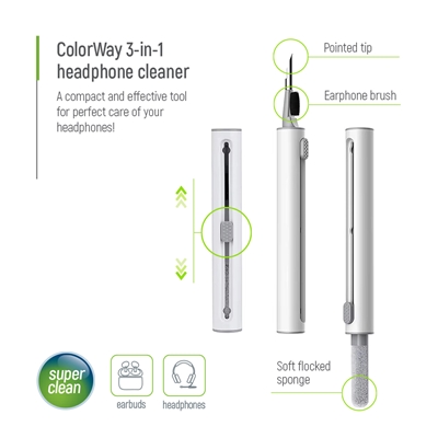 Keep your headphones spotless with the ColorWay 3-in-1 Headphone Cleaning Pen. This compact tool features a flocked sponge, brush, and metal tip for thorough cleaning of hard-to-reach areas, ensuring your audio gear stays in pristine condition.