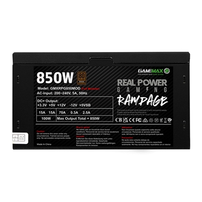 The Gamemax RPG Rampage 850W Fully Modular PSU delivers reliable power with 80 Plus Bronze efficiency. Featuring a 14cm silent fan and flat black cables, it ensures optimal cooling and a clean look for your gaming rig. Ideal for both beginners and experienced