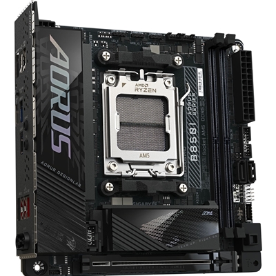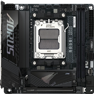 The GIGABYTE B850I AORUS PRO motherboard features an AMD AM5 socket, supporting Ryzen 9000/8000/7000 processors. With 2x DDR5 slots, dual M.2 sockets, USB-C ports, Wi-Fi 7, and 2.5GbE LAN, it offers high performance in a compact Mini-ITX form factor.