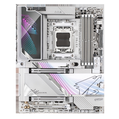 The GIGABYTE X870E AORUS MASTER X3D ICE motherboard supports AMD Ryzen processors with 4 DDR5 slots, 5 M.2 sockets, and advanced connectivity options including Wi-Fi 7 and 10GbE LAN, ensuring top-tier performance for gaming and productivity.