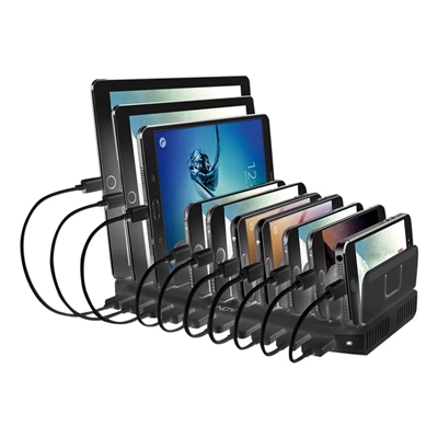 Simultaneous charging of up to 10 tablets, mobile phones and other USB devices