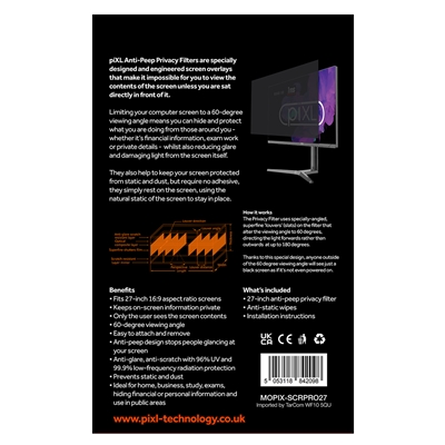 The piXL 27 Inch Monitor Privacy Screen protects your screen from prying eyes with a 60-degree viewing angle. It reduces glare, prevents static and dust, and is easy to attach and remove, making it ideal for home, office, or public use.