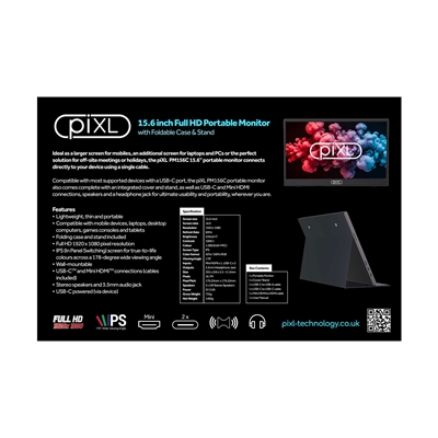 The piXL PM156C is a 15.6-inch portable monitor featuring Full HD resolution, USB-C and Mini HDMI connectivity, and built-in speakers. Its lightweight design and foldable case make it perfect for on-the-go presentations, remote work, and gaming.