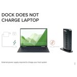 Note: This dock will not charge your laptop and will need your external charger to provide power to your system. Due to limited USB 3.0 bandwidth and reduced hardware graphics acceleration of the DisplayLink software and hardware used in this docking station we do not recommend it for use with full screen video playback, 2D or 3D graphics applications, or video editing software.