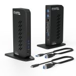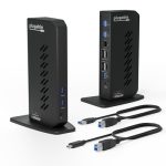 This USB laptop dock provides dual HDMI or DisplayPort video outputs, wired Gigabit Ethernet, 3.5mm combination audio jack, and six USB 3.0 ports. Includes both USB 3.0 and USB-C cables for flexible host connectivity