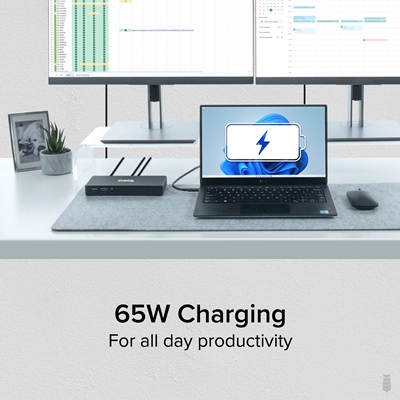 This plug-and-play USB-C docking station packs a lot of features for an “entry-level” dock. Extend up to 2x 4K 60Hz HDMI screens, power through with 65W charging, and connect it all with 1x USB-C, 3x USB, Ethernet, and Audio. It’s a laptop dock for doers