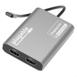 The Plugable USBC-6950M is a portable USB-C to dual 4K HDMI adapter that enables dual monitor setups from a single port. Compatible with Mac, Windows, and ChromeOS, it enhances productivity with seamless DisplayLink technology.