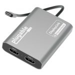 The Plugable USB-C Dual HDMI Adapter for 2 monitors (USBC-6950M) features dual 4K 60Hz HDMI ports, DisplayLink technology (driver installation required), and a sturdy aluminum design. Ideal for traditional and hybrid offices using MacBooks