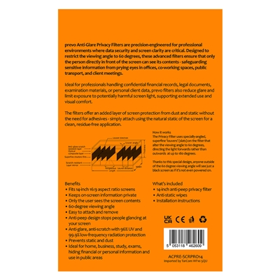 The PREVO 14-Inch Laptop Privacy Screen protects your sensitive information with a 60-degree viewing angle, ensuring only you can see the screen. Its anti-glare and anti-static features enhance visual comfort while safeguarding your data in public spaces.