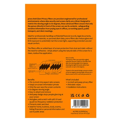 prevo Anti-Glare Privacy Filters are precision-engineered for professional environments where data security and screen clarity are critical. Designed to restrict the viewing angle to 60 degrees, these advanced filters ensure that only the person directly in front of the screen can see its contents – safeguarding sensitive information from prying eyes in offices, co-working spaces, public transport, and client meetings.