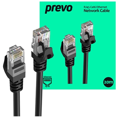 The PREVO CAT6-BLK-20M Network Cable offers a reliable connection with RJ45 connectors, featuring oxygen-free copper core and a durable PVC outer sleeve. Perfect for home or office use, this 20m cable ensures optimal performance for your network devices.