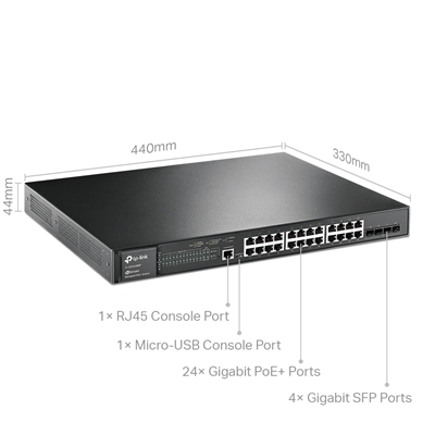 The TP-Link JetStream TL-SG3428MP is a 28-port managed switch featuring 24 PoE+ ports with a total power budget of 384W. Ideal for small businesses, it offers centralized cloud management, robust security, and advanced QoS for efficient network performance.