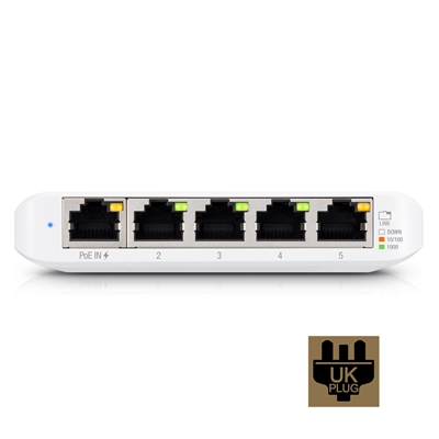 Build and expand your network with the UniFi Switch, part of the Ubiquiti UniFi Enterprise System. The UniFi Switch, model USW-Flex-Mini, is a smart managed Gigabit switch. It offers 5 RJ45 Ethernet ports, providing 1 Gigabit links to your devices. Power up the USW-Flex-Mini with the included USB Type-C power adapter or with 802.3af PoE Ethernet in port 1.